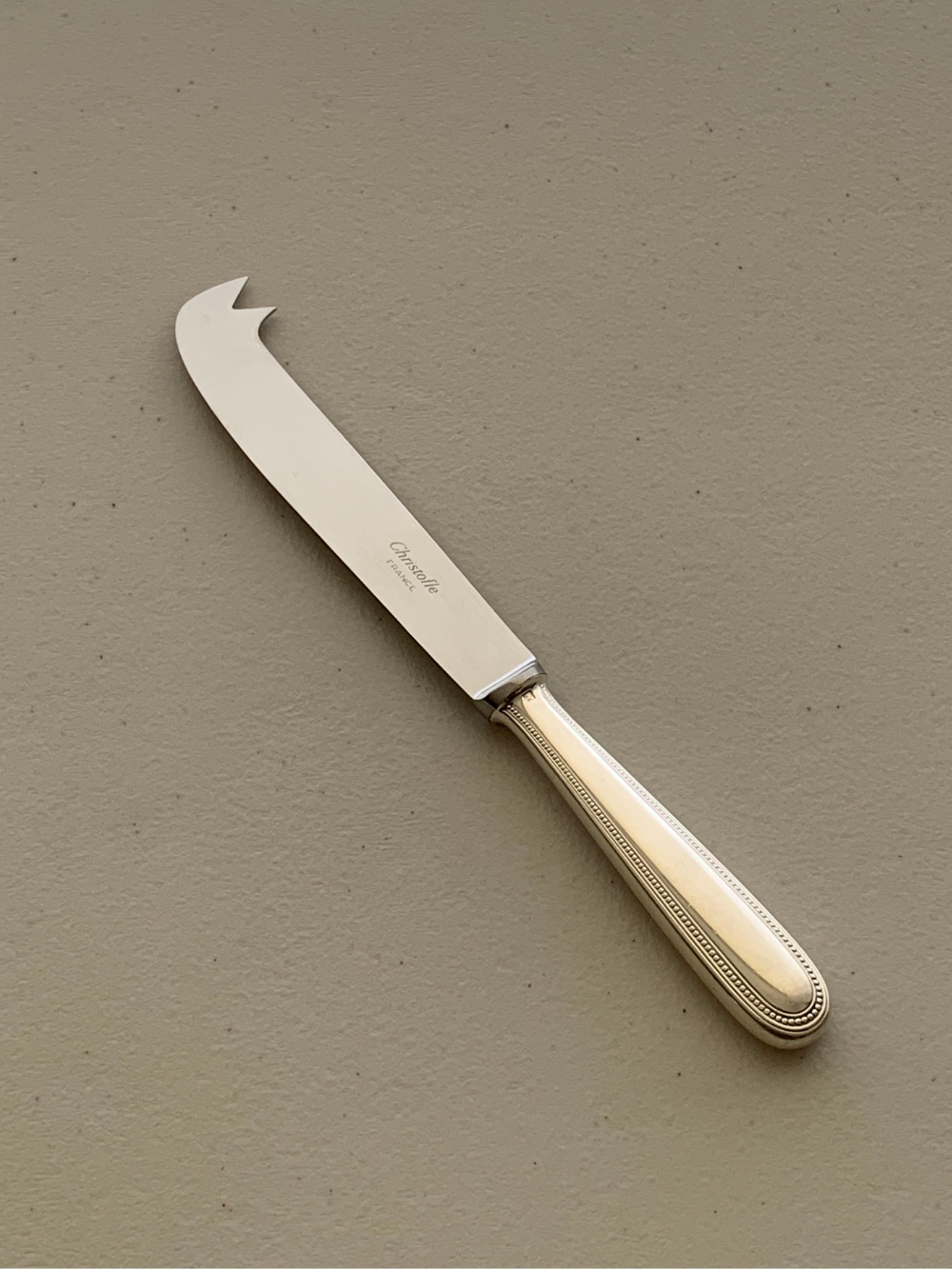 Cuchillo para quesos Christofle, modelo Perla. Pensado para cortar y servir quesos, especialmente semiduros y curados. La hoja incorpora una abertura en la punta que ayuda a separar y servir las porciones con facilidad. Un utensilio práctico y elegante para acompañar tablas de quesos en la mesa. 20cms de largo