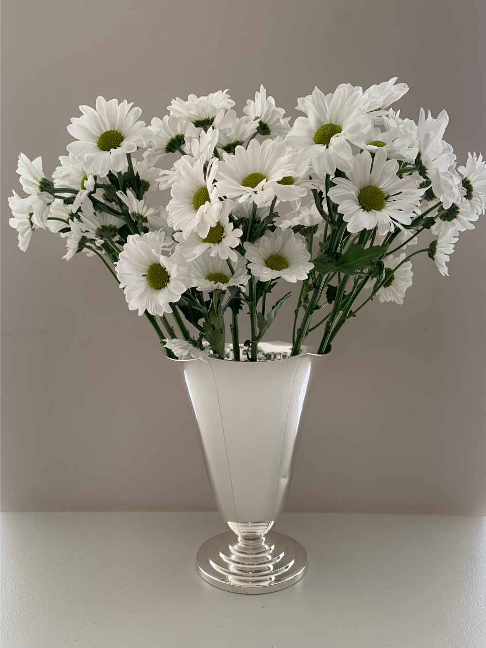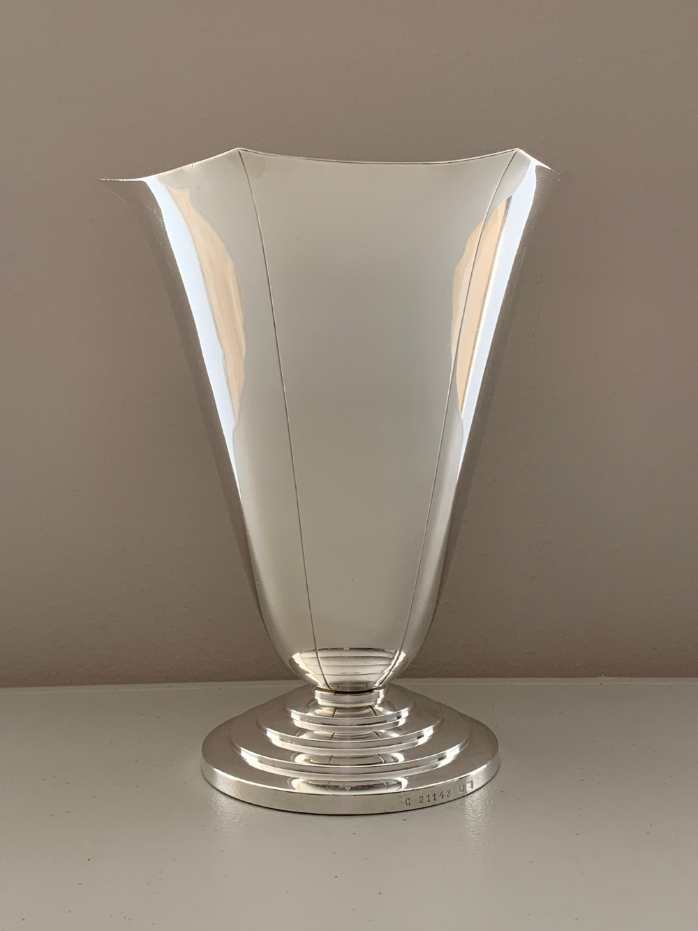 Funciona tanto como pieza central en una mesa, sobre una consola o en una repisa, donde el brillo del metal y la forma clásica acompañan arreglos florales frescos o secos, sumando luz y elegancia al espacio. 21.5 cms de alto, 16.5 cms diámetro superior, 11 cms diámetro base.