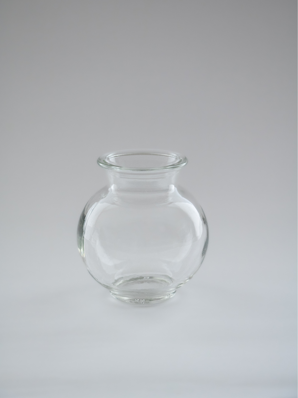 Pequeño florero de vidrio transparente, con forma redondeada y cuello corto ligeramente abierto. Su diseño limpio y clásico lo hace perfecto para flores de tallo corto o pequeños arreglos naturales. También puede usarse solo, dejando que su transparencia y brillo aporten una nota ligera y fresca en cualquier espacio.