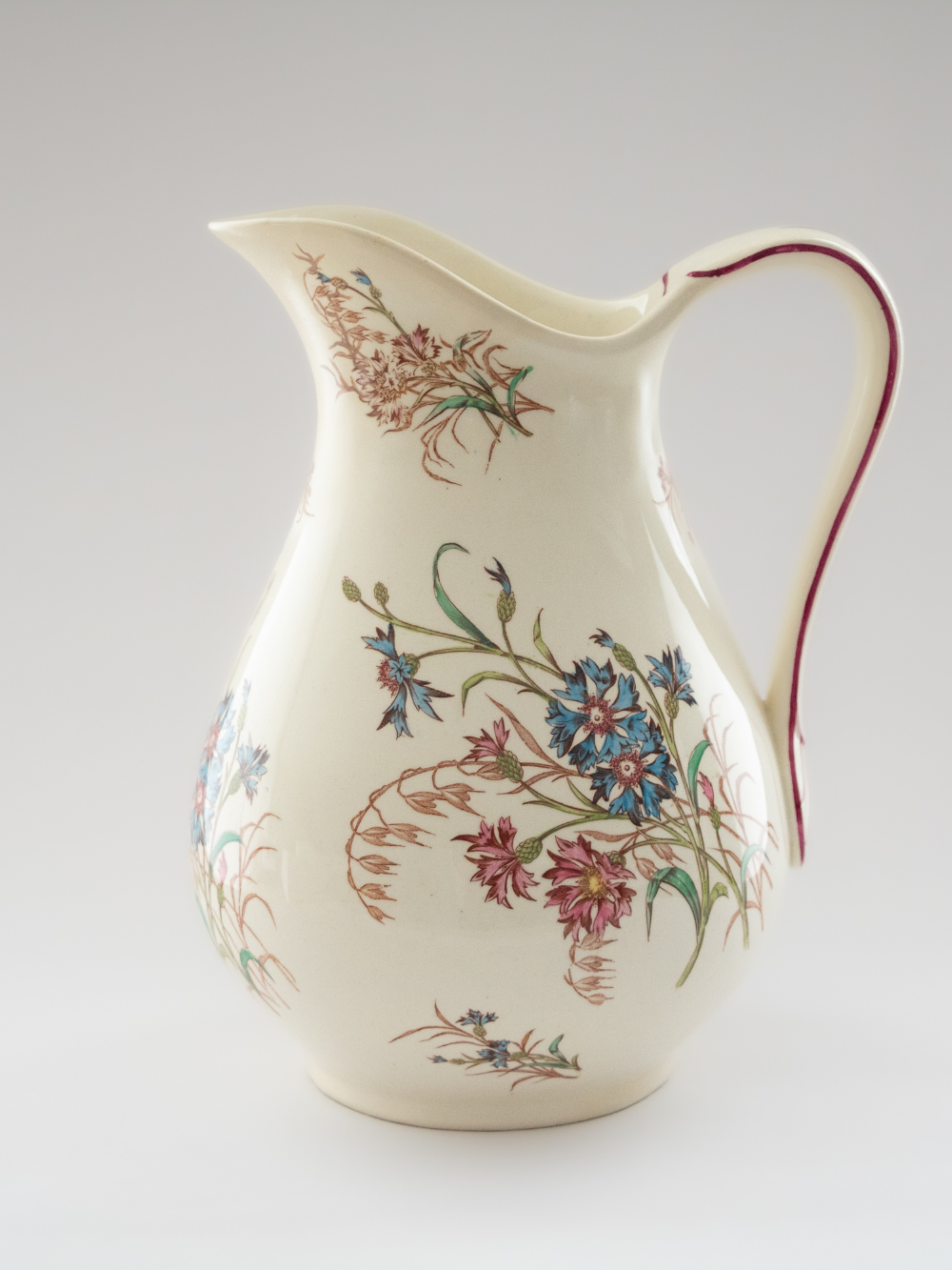 Imponente jarra de loza de la prestigiosa casa francesa Luneville. Su tamaño generoso y diseño la convierten en una pieza ideal para lucir en vitrinas, aparadores o como florero para ramos frescos o secos. Un objeto con encanto francés clásico, perfecto para aportar carácter y distinción a la decoración. 29 cms de alto.