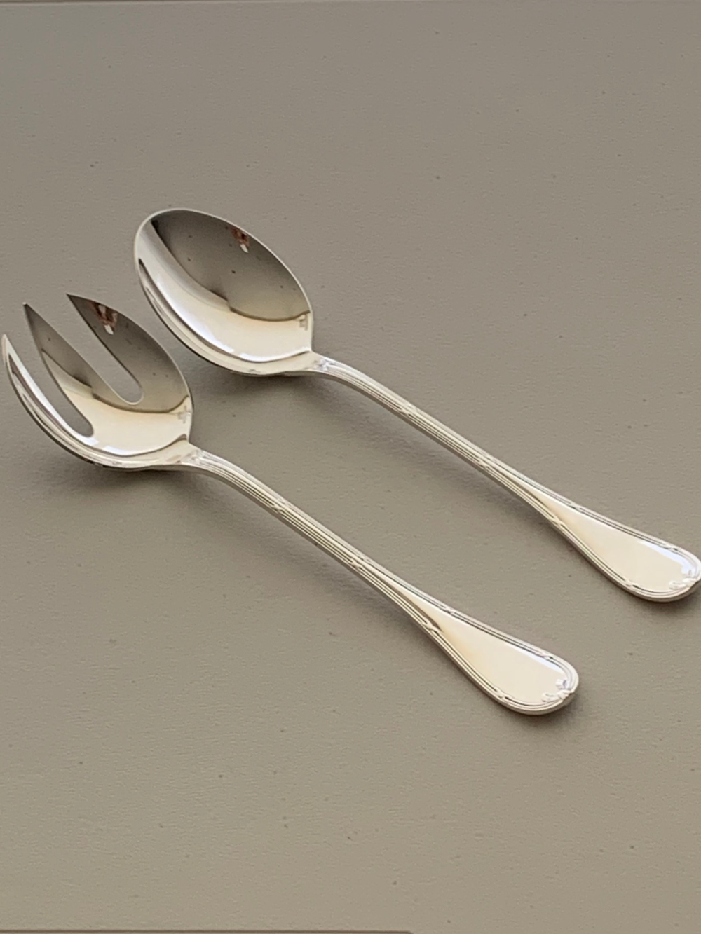 Compuesto por cuchara y tenedor de servicio, ideal para presentar y servir carnes en la mesa. Su tamaño y forma permiten manipular piezas con comodidad, mientras que su diseño clásico y acabado brillante acompañan tanto mesas formales como informales. 25 cms de largo