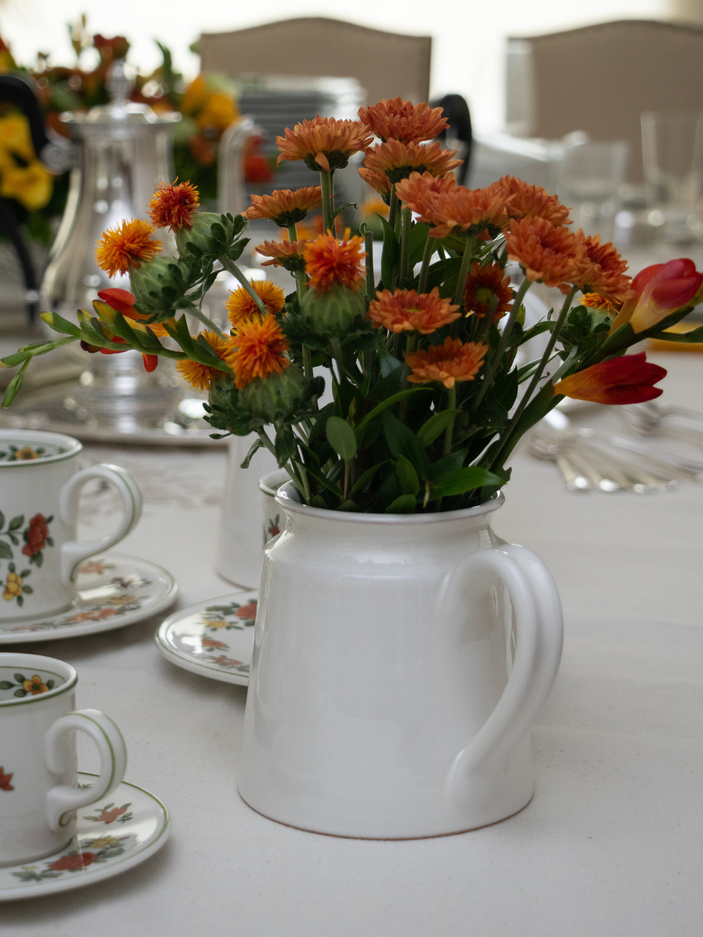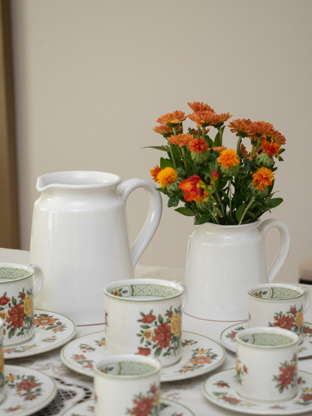 Conjunto de dos jarras de cerámica italiana en color blanco, de tamaños diferentes. Su diseño limpio y elegante las hace versátiles, ideales para servir bebidas, colocar flores frescas o secas, o lucir como piezas decorativas en cocina y comedor.