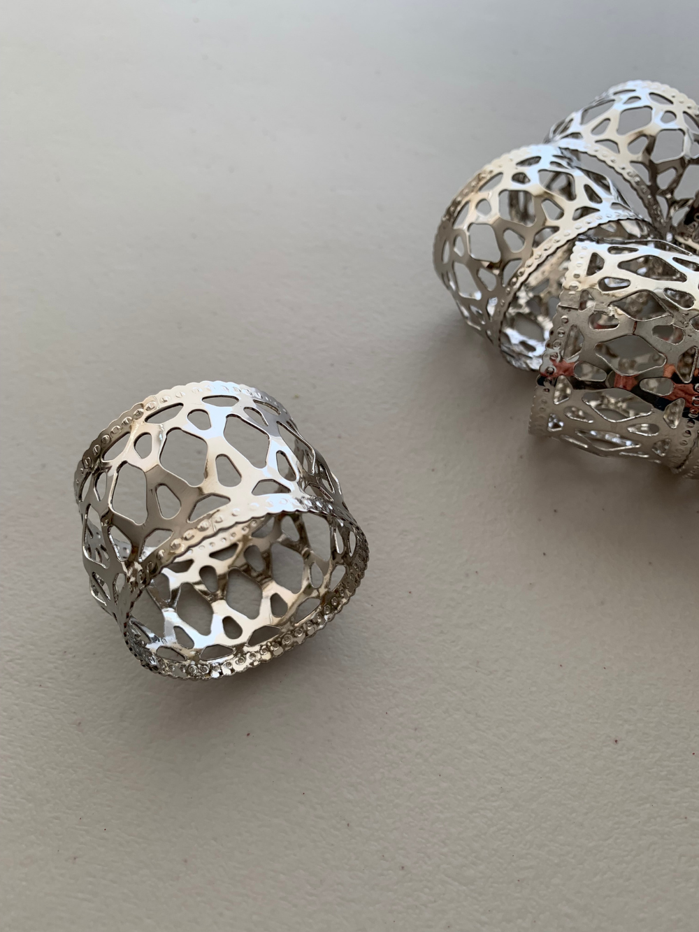 Servilleteros de metal plateado con delicado diseño calado que aporta textura y brillo a la mesa. Su forma simple y elegante enmarca la servilleta y suma un detalle especial a la presentación.