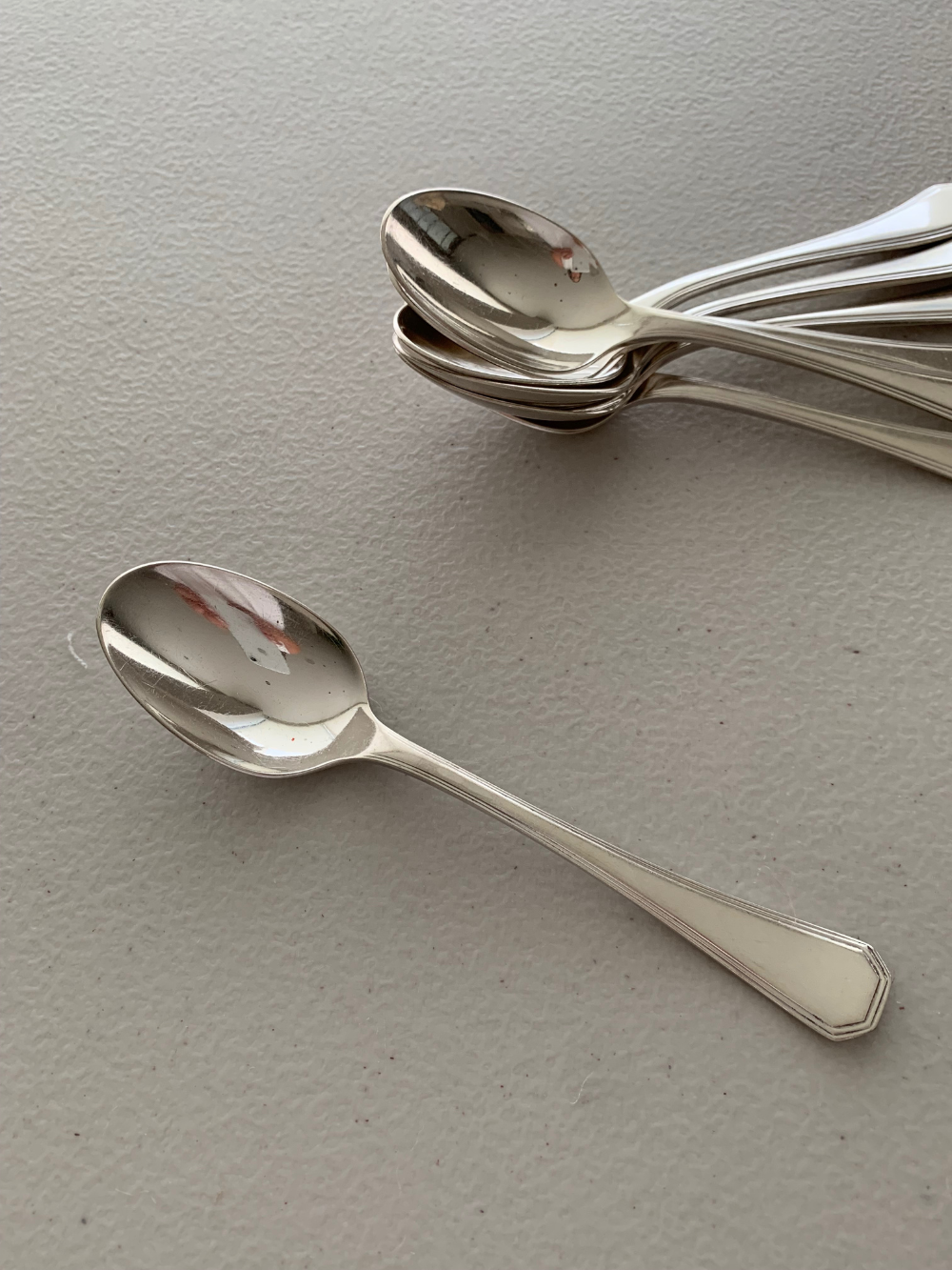 Estas cucharas francesas de los años 40 destacan por su diseño octogonal limpio típico del movimiento Art Déco. De metal plateado, han sido escogidas para devolverles el brillo original sin borrar la historia que llevan consigo. Perfectas para acompañar un café, un postre o una sobremesa especial. Set disponible a juego con sus tenedores, sujeto a disponibilidad. 15 cms de largo