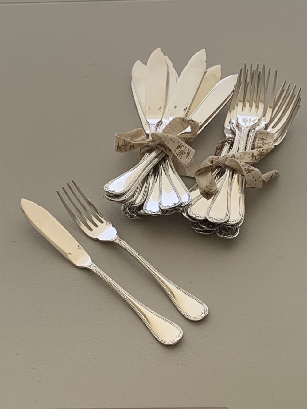 Juego de cubiertos diseñado para el servicio y consumo de pescado. El cuchillo, de hoja ancha y sin filo marcado, permite separar la carne con facilidad, mientras que el tenedor acompaña el gesto sin dañar la textura. Ideales para mesas formales o comidas donde el pescado es protagonista. Set de 12 puestos, 24 piezas. 19.5 cms de largo