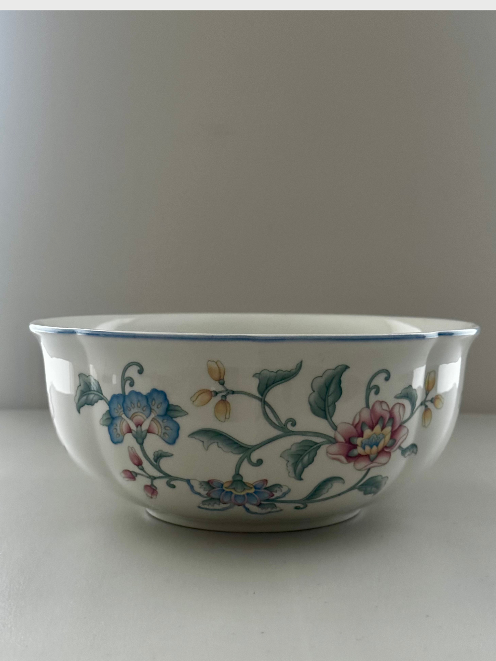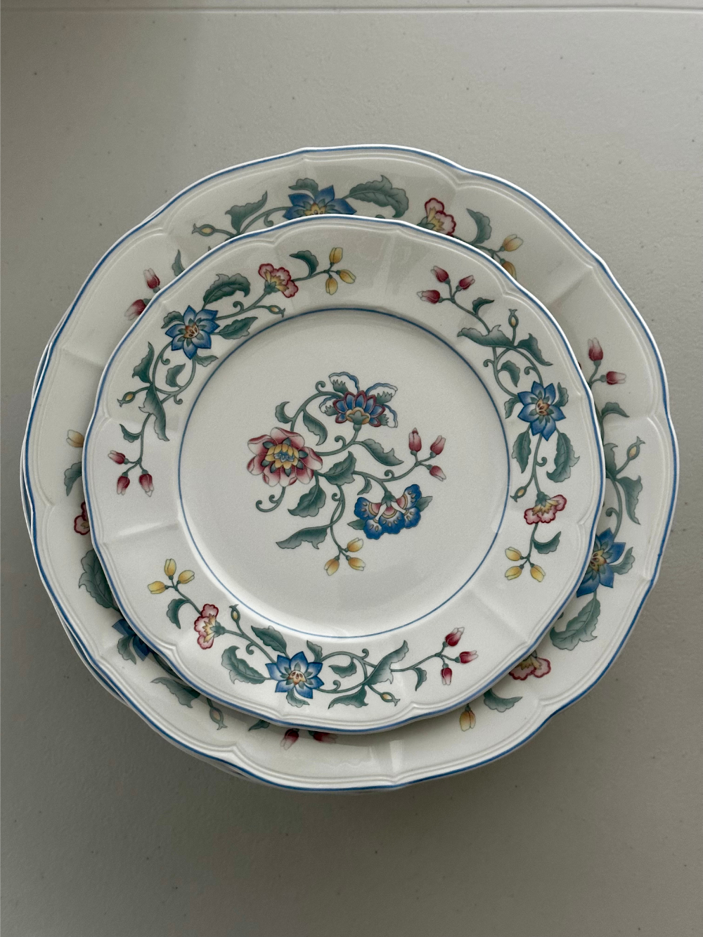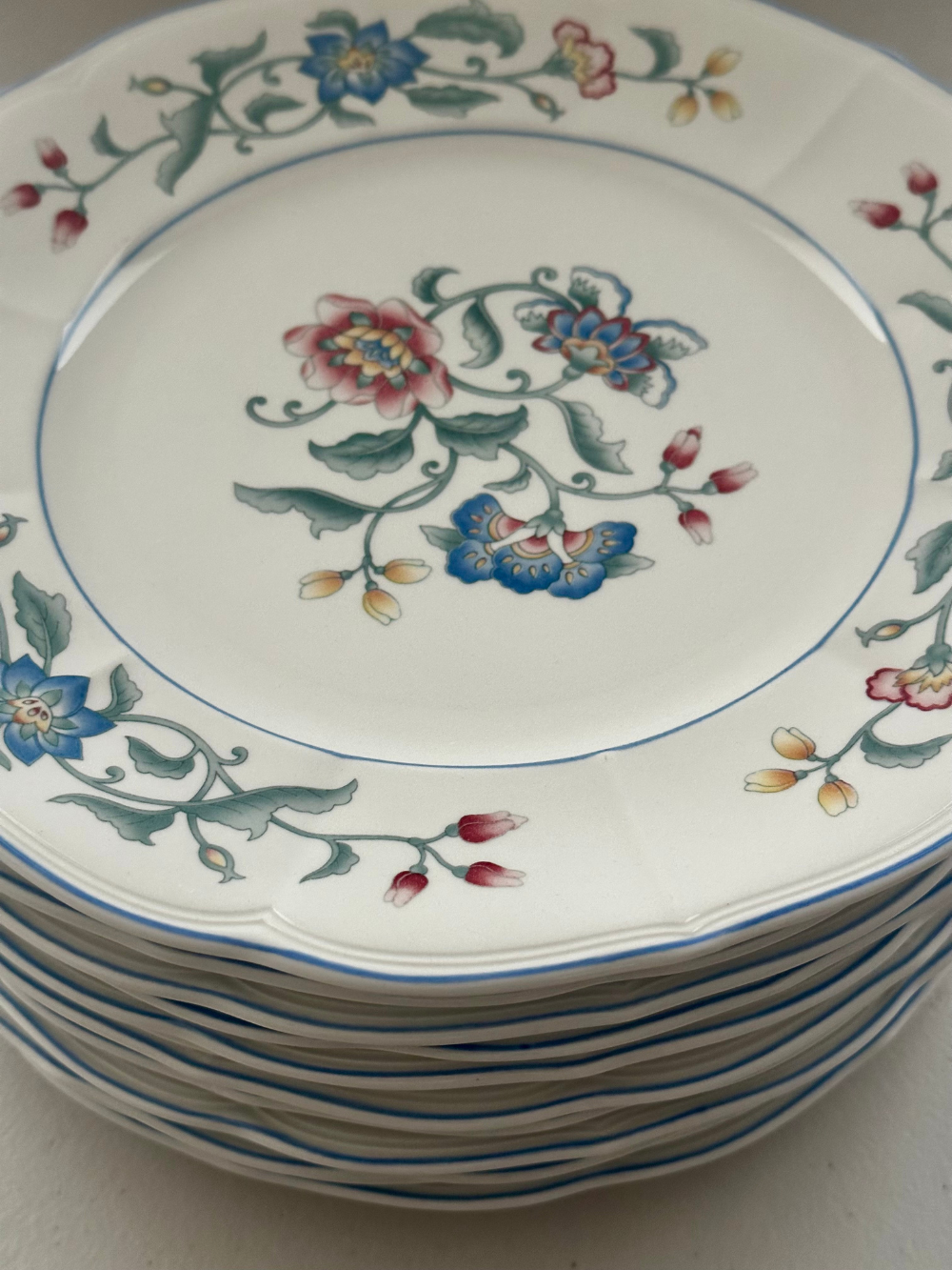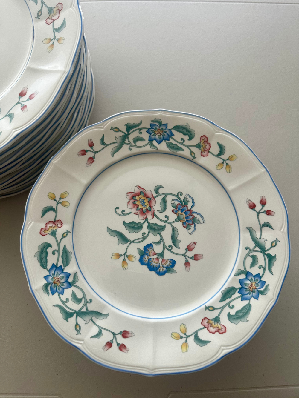 Set de 15 platos grandes y 15 medianos y una bandeja de servir de Villeroy & Boch, modelo Delia, en porcelana fina. Su decoración floral delicada presenta flores estilizadas de inspiración campestre, en una paleta suave de tonos lila, rosa empolvado y verde, que aportan frescura y elegancia a la mesa. Un diseño atemporal, ideal para vestir tanto mesas cotidianas como ocasiones especiales. 31 piezas