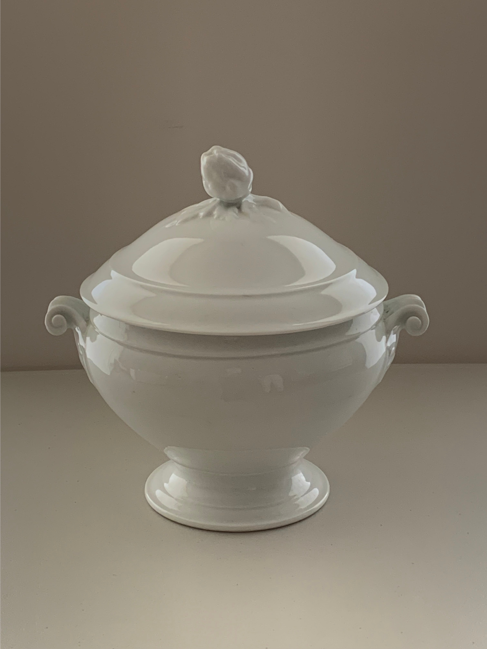 Sopera de porcelana blanca con tapa y asas laterales. Su diseño clásico, con líneas suaves y detalle superior en forma de fruto, la convierte en una pieza elegante para el centro de mesa. Ideal para servir sopas, cremas o guisis y tambien como objeto decorativo en cocinas o comedores.