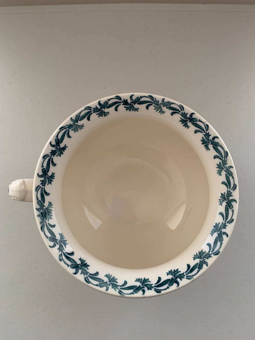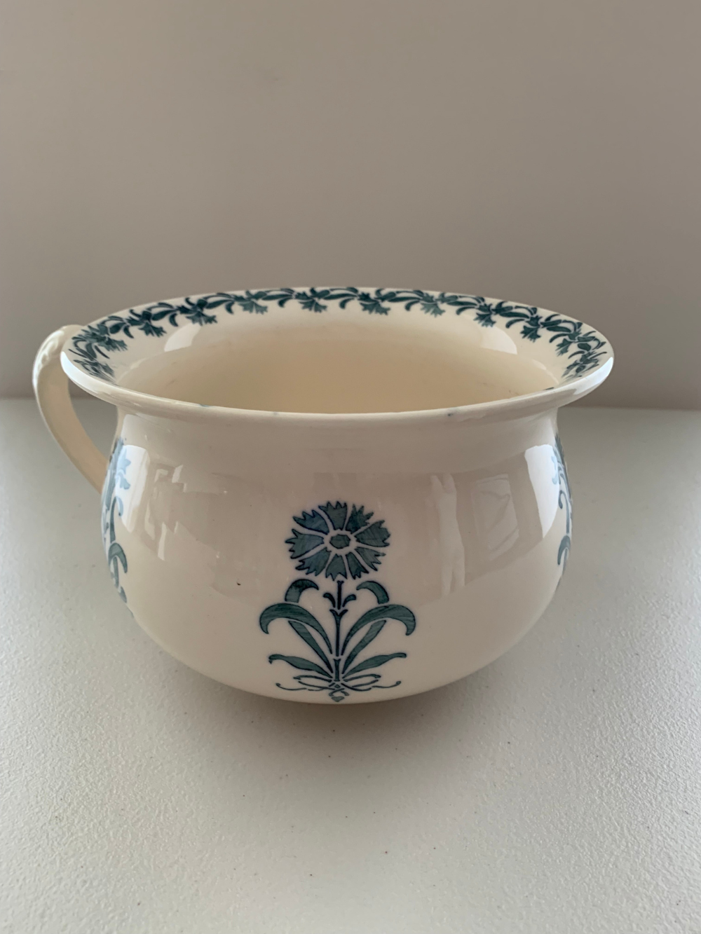 Pieza de loza esmaltada en tono marfil con delicada decoración floral en verde azulado y guarda vegetal en el borde. Su forma redondeada y el asa lateral evocan los objetos domésticos de otra época.